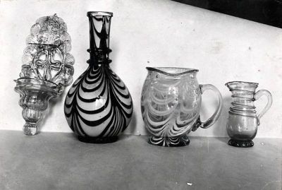 Fénykép - üvegtárgyak (szenteltvíztartó, palack, korsó és kis kancsó) magyar, üveg, XIX. sz.
