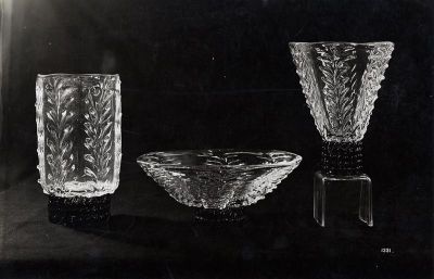 Fénykép - Zecchin, Vittorio (?): Díszüvegek (vázák és tál), plasztikus levéldísszel, Murano