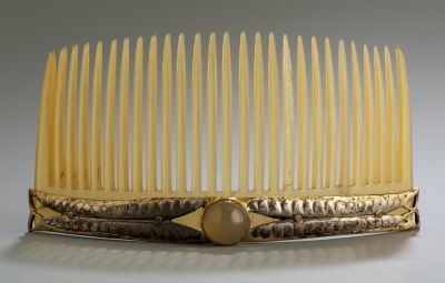 Sárgás színű, áttetsző szaruból fűrészelt, téglalap alakú, sűrűfogú kontyfésű. A rászegecselt, öntött, áttört, stilizált szimmetrikus ezüstdíszítmény közepén tokos foglalatban sárgás színű, gömbölyű, domborúra csiszolt (cabochon) kalcedón.