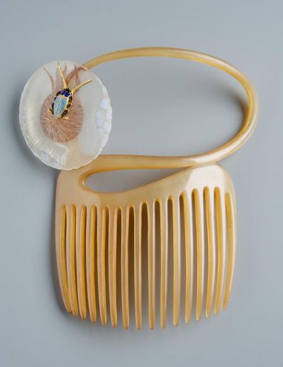 A világosszínű, áttetsző szaruból fűrészelt fésű ívelt felső része fordított S-alakban magasra kanyarodó indában folytatódik. A szár végének színtelen üvegből homályosra maratott ornamense a pitypang (Taraxacum officinale) kerek, pelyhes kaszattermése. Középen naturalisztikus hűséggel megjelenített zománcdíszes motívum: aranybogár, két hosszú csáppal, kék kitinpáncéllal, fekete lábakkal. A bóbita egyenetlen vastagságú pereme szélesebb részein kékesen opalizál. A japán hatásra divatba jött fésűtípus jellegzetes példája.