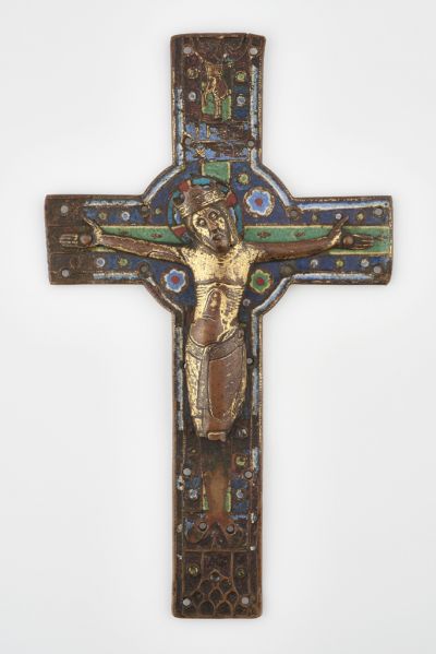 Az itt bemutatott limoges-i feszület, amely a gyűjtemény legrégibb zománcműves darabja, egykor egy körmeneti kereszt elülső lapja volt. A plasztikusan megformált Krisztus alakja fölött a kereszt szárának csúcsán az Atya áldást osztó kézfeje láthaó, alatta az IHS és XRS betűkkel. A keresztfát zöld színű zománcsáv jelzi, melyet kék alapon színes zománcos pettyek, körök és virágok öveznek.