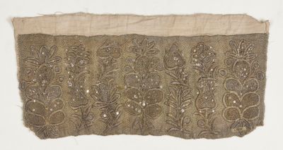 Anyag: | arany színű fémflitter; arany színű fémfonal; lenvászon |