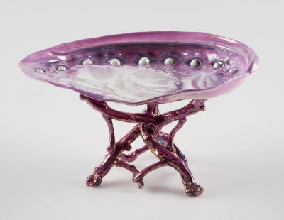 Technika: | fémlüszter-mázzal fedett; negatív forma felhasználásával készült; öntött és mintázott elemekkel |