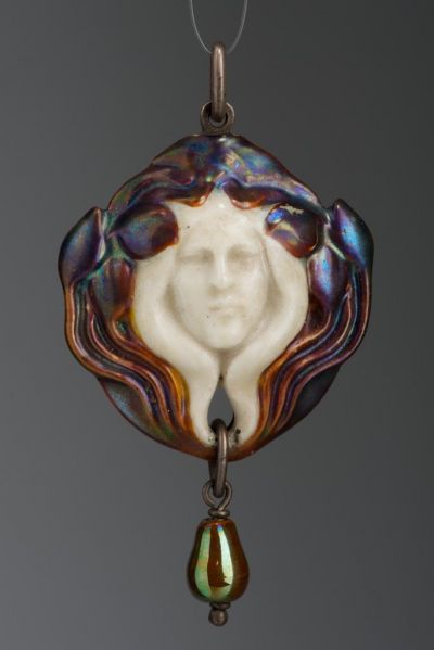 Ezüst alaplemezre erősített, színes mázzal borított, kézzel formázott kerámiaábrázolás: lilás crocus-bimbók (tarka sáfrány, Crocus variegatus) keretében elefántcsontszínű, hosszú hajú női arc. Az ékszer felső részén ezüst függesztőkarika, aljáról zöld eozinmázas gyöngyszem lóg. Hátoldalán a tulajdonosra utaló vésés: „1905 nov. 5-én Józsi". (Dr. Alföldi József készíttette menyasszonya, Angyal Irma számára.) A Zsolnay gyárban Horti Pál és Hibján Samu kezdeményezésére készítettek először ékszereket, melyekből több darabot is bemutatott az O. M. Iparművészeti Társulat 1902. évi karácsonyi kiállítása. Közöttük lehetett e függő, melynek rajza Zsolnay „Ékszerek” mintakönyvében (l. Janus Pannonius Múzeum Ad. ltsz.: 1432-81) a Nr. 12 alatt szerepel, 6, 50 koronás ármegjelöléssel. Horti Pál és Hibján Samu részére elkészítették a függő „Carrara marmor", vagyis carrarai márvány hatású változatát is. Aranyozott ezüst montírozású példányainak ötvösmunkáját Kubinyi J. végezte.