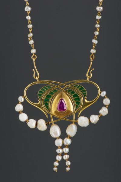 A kétkaréjos, áttört aranyfüggőt két egymásba fonódó ellipszis képezi. Alsó részéhez kétoldalt egy-egy S-alakban ívelt drót kapcsolódik, ráfűzött, növekvő méretű gyöngyökkel. Az ellipszisek közeiben háromszög alakúra csiszolt rubin, két oldalán zöld azsúrzománcos „lebenyek". Két kampóval illeszkedő láncán a szemek apró, sűrűn felfűzött igazgyöngyökkel váltakoznak. Az O. M. Iparművészeti Társulat 1905. évi karácsonyi kiállításán Tarján Oszkár több, Apáti Abt Sándor tervei szerint készült, arany, ékköves díszű násfát, melltűt mutatott be. A kiállított függőhöz hasonló darab képét közli a Magyar Iparművészet (1906. p. 11., 17. kép).