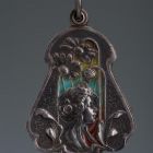 Egymás fölött elforgatható két lapjának karéjos, lefelé szélesedő alakja lecsüngő virágkehelyre emlékeztet. Felső lemezén három felnyúló virágszál és levelek között jobbra néző női fej: szeme behunyva, lazán föltűzött hajában virág. A háttér középső, azsúrzománcos sávjának színei: halványzöld, világoskék és piros. A felső lapot elfordítva előtűnik a tükröt magában foglaló, megegyező alakú alsó lap. Chatelaine tartozéka lehetett.