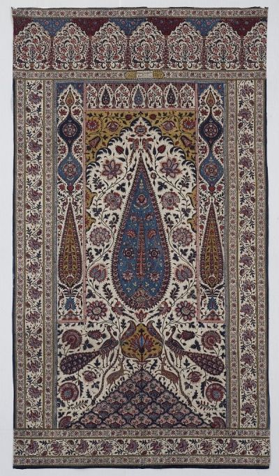A szövet az iszfaháni un. qalamkari textilek jól ismert csoportjába tartozik: a papírvékonyságú, fényes felületű, színesen mintázott (kézi munkával festett, nyomott vagy rezervált) kartonokat a perzsa otthonokban, sátrakban ajtófüggönyként, faliképként, ágy-, vagy asztalterítőként, illetve viseletek anyagaként, béléseként használták. Európában függönyszárnyként voltak kedveltek. Bár látszólag mechanikus munka, valójában a számos fennmaradt példány között szinte nincs két egyforma, noha alapmotívuma, a hegy ciprusfával szinte mindig megjelenik. Három kartusba osztott perzsa felirata is az egyéni teljesítményt hangsúlyozza: „Hag Hoseyn Rabice Mohammad qalamkarja száz kiváló [munka] legjobbika.” Az önállóság határait jelzi ugyanakkor, hogy ez a szöveg, ugyanebben a hármas beosztásban más korabeli qalamkari textileken is megtalálható, csak a mesternév cserélődik.