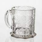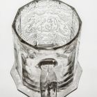 Tízszögre csiszolt kihajló talpperemen henger alakú test, szalagfüllel. A pohártest alján köszörült sugaras dísz, szájpereme mentén rácsos díszítménysor. Testén dús rocaille-os kartusban kurzív MO és TS monogramok.