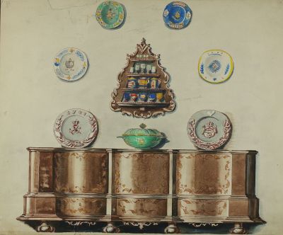 Bútorterv - tálaló, falon tányérok és polcos bögretartó