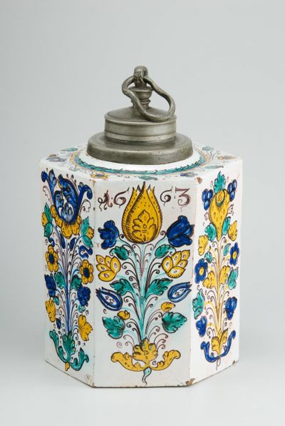 Hatszögletű hasáb, ívelt vállal, ónba foglalt csavarmenetes szájnyílással. Fedelén a tagolt részbe csavarmenettel illeszkedik a két, emberfejjel díszített, lapos karikával ellátott dugó. Oldallapjain egy-egy stilizált virágtő. Felső lapján az óngyűrűs szájnyílás körül levélkoszorú kis virágokkal. Fehér alapon mangánnal kontúrozott és árnyalt, kékkel, zölddel és sárgával festett. Az egyik virágtő két oldalán fent 1663-as évszám.