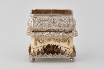 Négy, gömbös lapos téglalap alakú talapzaton álló palmetta levélsoros peremszéllel. Ebből emelkedik ki a négy, kifelé hajló lábon álló, csavarral hozzáerősített, kétrekeszű fűszertartó. Alján virágdíszek, pereme kiálló, oldalain figurális jelenetek: két hosszabb oldalán egy-egy fekvő, olvasó, illetve pipázó férfi, két keskenyebb oldalán gyümölcsköteg galambokkal, illetve nyulakkal. A csésze és a talp között, összekötő elemként, elefántcsont-betét vésett alapon feketés festékkel bedörzsölt díszítéssel hosszabb oldalain gyümölcsfüzér, rövid oldalain kutyával játszó fekvő férfi, a másikon galambpostát küldő fiatal nő, jobbjában sarló.