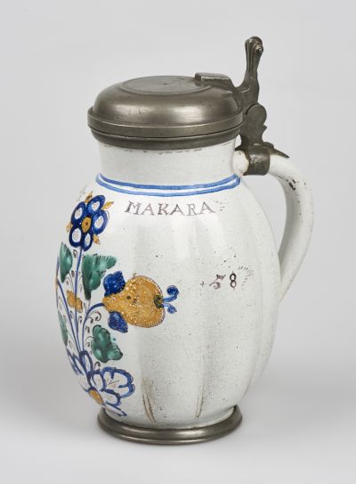Ónfoglalatú talp fölött tojásdad gerezdelt test, rövid, az ónba foglalt szájperem felé szélesedő nyak. Füle ívelt. Ónfedele csuklós, ujjtámaszos. A nyak tövénél körbefutó kettős kék csík alatt stilizált virágos, gyümölcsös, leveles növényi díszítmény. Festése fehér alapon mangánnal kontúrozott és árnyalt kék, zöld és sárga. Az edény vállán GEORIVS. MAKARA felirat, hasán kétoldalt 1658-as évszám.