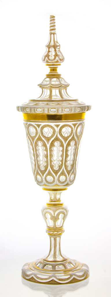 Széles, középrészénél kúposán emelkedő talpon, fordított körte alakú gombbal tagolt nyélen, felfelé fokozatosan bővülő henger alakú test. Fedele kupolaszerűén felépített, tagolt, tetején a szár kialakítását ismétlő, körte alakú gomb. Az egész testen (a felső, tejüveg réteget részben lehámozva) csiszolt, geometrikus motívumok: körök, ún. szamárhátívek, vízcseppmotívumok, félkörívek. Az átlátszó üveg alsó rétegét mutató csiszolt motívumok között, a meghagyott tejüveg réteg dúsan aranyozott, arabeszk díszítéssel. A csiszolatok körvonalai és a szájperem aranyozással hangsúlyozottak.