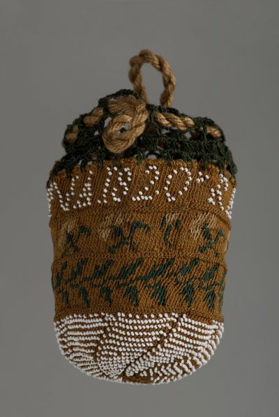Dohányszínű, alja domború, fehér gyöngyszemekkel, fölötte homokszínű, azonos állású szegfűtövek sávja zöld levelekkel. Legfelül fehér gyöngyből név és évszám: RADNITS MAGDOLNA 1820. Szegélye palackzöld pamutfonalból horgolt és sodrott homokszín zsinórral összehúzható.