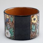 Egyenes kerek talp felett emelkedik a hengeres test. Oldalán négy, téglalap formájú betétmezőben kétszer ismétlődő mintájú díszítés, ún. tube technikával. A kimagasodó kontúrvonalak között leveles virágszál, illetve virágszál és indán ülő madárka. Az edény belseje és az alap fehérmázas, a betétdíszek háttere aranyozott, a levelek zöldek, a virágok narancsszínűek, a kismadár kék és sárga. A 61.75. leltári számú tárgy az itt bemutatottal megegyezik, belsejének a kialakítása eltérő. A Magyar Iparművészet 1912 (15), 210. közli a kis tárgyak terveit, az Országos Magyar Királyi Iparművészeti Iskola keretében megnyílt kerámiai oktatásról beszámolva. Simay Imre szobrászművész és a Wiener Keramik műhelyéből Pestre hívott szakoktató, Schleich Vilmos – e tárgyak tanúsága szerint is – követendő példaként állította a növendékek elé Josef Hoffmann és a Wiener Werkstätte díszítőművészetét.