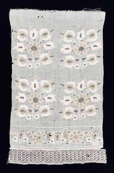Technika: | fémfonalas hímzés; hímzett; vagdalásos hímzés; vert csipkeszegély |