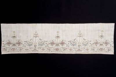 Technika: | hamis laposöltés; mintásan letűzött fémfonalas hímzés; száröltéssel hímzett |