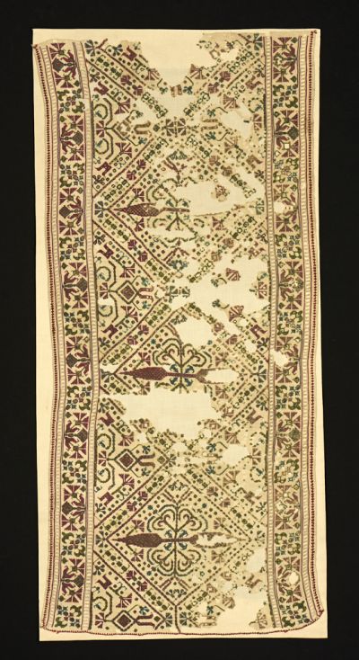 | Anyag: | arany színű fémfonal; vászon, selyem |