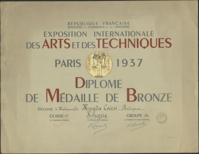 Díszoklevél - a Párizsban nyert bronzéremről Czécsy Magda részére