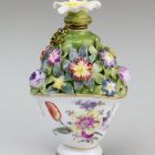 | Technika: | aranyozott; máz felett színesen festett; öntött és mintázott elemekkel; plasztikus díszítés; réz zárókupak |