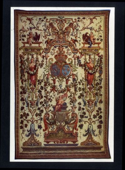Illusztráció - Groteszkek a Lotharingen-Orleansi egyesített címerrel c. gobelin, Lotharingiai Károly hőstettei sorozat, Baldass, Ludwig: Die Wiener Gobelinsammlung c. műből