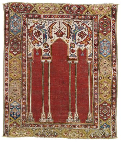 A szőnyeg vörös alapszínű, hármas tagolású imafülkéjét (mihrab) 1+2+2+1 megosztásban, talapzaton álló, karcsú oszlopok tartják. A két szélső, alacsonyabb boltívről egy-egy kék virágszál függ. A boltívek feletti nyers színű mezőben kétoldalt két-két egymásra hajló, arabeszkszerű sarlós levél fogazott rozettát, középen két fogazott szélű levél palmettát fog közre. Fő bordűrje okker alapon váltakozó színű, nyújtott hatszögű kartusok sorából áll, közepükben rombusz alakú rozettából kinövő szegfűkkel. Külső és belső mellékbordűrjében felhőszalagokkal kapcsolt apró csillagsor fut.