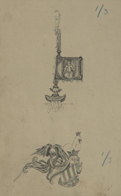 Iniciálé-terv - ”U” betű leány alakjával, „W” (?) betű Nagy Lajos király címerével