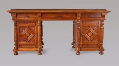 Íróasztal: nyolc pogácsalábon álló, szabadon álló íróasztal, melynek mindkét hosszanti oldala azonos kiképzésű. Jobb- és baloldalán egy-egy ajtó, melyeknek tömör lapja vésett motívumokkal díszített. Az ajtók mögött mindkét oldalon három-három angol fiók. Az ajtós részek felett egy-egy keskenyebb, középen egy-egy szélesebb fiók helyezkedik el a lap alatt.