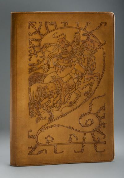 Sarkainál megkopott, színei egyöntetűen barnásra fakultak. Az előoldalon a jobb alsó sarokból kiinduló, írott kettes számra emlékeztető ágas-bogas inda által keretelt mezőben lovon vágtató, történeti magyar kosztümbe öltözött solymászó pár. A két figurában, Gellér Katalin megállapítása és szíves szóbeli közlése szerint a művész és felesége portréja ismerhető fel. A ló hátsó patáinál Nagy Sándor monogramos jelzése. A hátoldalon az előlapot keretelő indamotívum önállóan szerepel néhány szeszélyes hurkot rajzolva kitölti az egész felületet. A régi leltárkönyvek szerint a festés eredetileg vörös és barna volt. A mappa belsejében bal oldalt egyenesen, jobb oldalt ívelten nyíló rekesz és egy kiemelhető papírtartó.