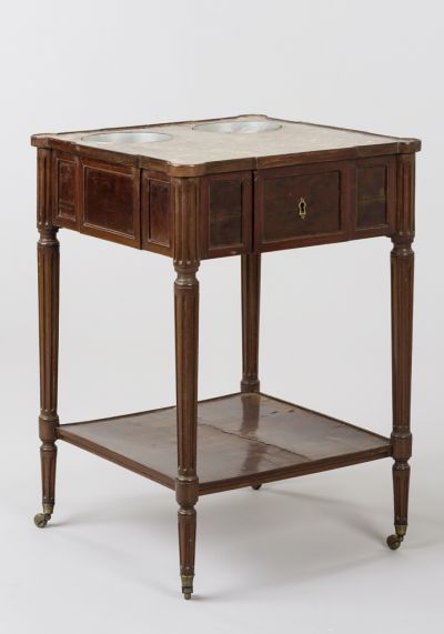 Négy, bronz görgős, felfelé szélesedő, vájatok, hengeres lábát lent négyzetes polc kapcsolja. Viszonylag széles kávájában egy fiók helyezkedik el. Márványlapja a sarkokon lekerített, középen két kerek nyílás alatt italhűtő rész.