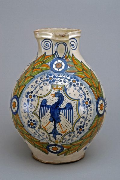 A magas, öblös kancsó, nyaka rövid, széles. Szájnyílása háromkaréjos, kiöntőcsőrét a tagolt szájperemből becsípéssel alakították ki. Hosszú füle széles, ívelt, az edény nyakához és hasához illeszkedik. Az edény hasát négy rozettával négyfelé osztott, stilizált babérlevélkoszorú díszíti, benne a Montefeltro család címerével. A családi jelvényen megjelenő, szárnyát kiterjesztő fekete sas helyett a heraldikus madár itt kék színű. (Az itáliai majolikákon ekkor igen ritka a fekete szín használata, amit mangánoxiddal és további oxidok hozzáadásával lehetett kikeverni.) A címerpajzs körül stilizált indás, leveles, virágos díszítmény. A babérkoszorútól az edény füle felé lendületesen csavarodó szalagok. A kiöntőcsőr alatt hurok, két oldalán egy-egy csavarodó indával.
