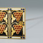 Négyzetes, lapos, stilizált szőlős díszítéssel. Keskeny fehér peremén, a sarkoknál és a felezőpontokban kék félkörök. Közepén fekete alapon szőlőtő aranylevelekkel és -kacsokkal, két-két, egymás fölött oldalra lehajló vöröses, plasztikus fürttel.