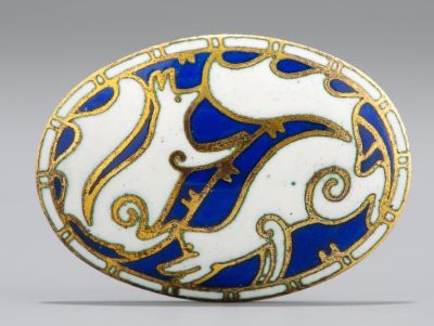 Ovális, enyhén domború, stilizált állatfigurákkal. Keskeny fehér perem, közepén kék alapon két fehér mókus. A zománcmina rajzát az „Orsz. M. Kir. Iparművészeti Iskola zománcozási osztályának munkái” közt közli a Magyar Iparművészet 1911 IV. (színes) melléklete