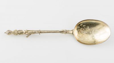 Ovális, domborított merítőjében vésett arabeszkes díszítmény. Négyhasábos nyele íves, leveles tagozattal kapcsolódik a nyélhez. Nyelének végén herma.