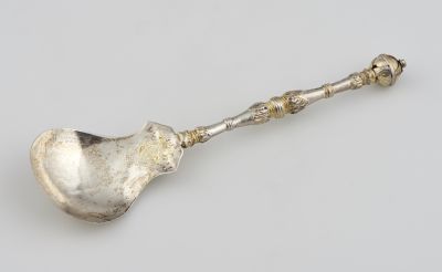 Lemezből domborított pajzsidomú merítő, belsejében a nyél tövénél vésett, aranyozott címerpajzsban családjegy, mellette ID betűk, fölötte 1571 évszám. A címerpajzson kívül, föltehetően későbbi korokból származó CG és háromszor beütött M (vagy megfordítva nézve: W) betűk. Merítőjére hátul fölfutó nyele kétszer tagolt reneszánsz baluszter idom, végén leveles gömbbel. Bár Laurentius Kiss ötvösjegyét nem használta e kanálon, de a címerpajzsban lévő családjegy azonos az általa használt ötvösjeggyel. Vö.: Kőszeghy 1936 Nr. 587.