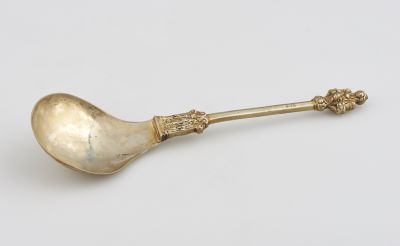 Domborított merítője csepp alakú, hátoldalára a nyél bordaszerűen felfut. A nyél tövénél elöl kartus alakban koronás félalak, hátul vésett családjegy. Hathasábos nyelének végén kétarcú női mellkép. Nyelén későbbi vésés: BJ monogram, fölötte ötágú korona.