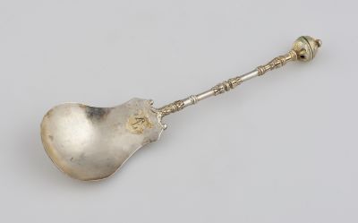 Lemezből domborított pajzsidomú merítő, belsejében a nyél tövénél aranyozott, vésett címerpajzsban ARB monogram. Merítőjére hátul felfutó öntött nyele kétszer tagolt reneszánsz baluszter, gyűrűs, leveles gömbvégződéssel.