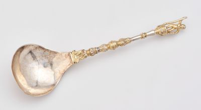 Mindkét kanál öblös, kerekded, kívül merevítő gerinccel („patkányfarokkal") bordázott merítője vékony, díszes, többszörösen tagolt nyélben folytatódik, melynek végét félgömbös talapzaton pajzsra támaszkodó, lándzsát (?) tartó puttó szobrocskája díszíti. A pajzsban vésett ásó, melyet MK monogram vesz közre. A merítő külső részének közepén, a merevítő gerinc két oldalán CW monogramos mesterjeggyel és 1646-ig használt városjeggyel jelzett. (A 18.907 leltári számú kanál nyelén a szobrocskát merőlegesen jobbra elfordítva forrasztották vissza.)
