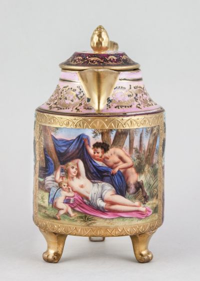 Három lábon álló, hengeres forma, ívelt kiöntővel, levélidomban végződő magas füllel. Ez utóbbi és a lábak aranyozottak. Az edénytestnek a füllel ellentétes oldalán mitológiai tárgyú festett ábrázolás: alvó Vénusz, leselkedő szatírral, Correggio festménye nyomán (ld. itt). A festett ornamensek domináns színei: vörös, kék, rózsaszín. Alján a bécsi gyár jelzése máz alatti kékkel, továbbá felirat máz feletti feketével: Venus wird von Satyr belauscht.