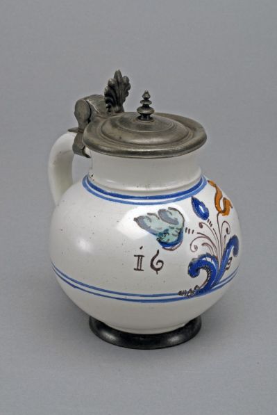 Az ónba foglalt keskeny talp fölött gömb alakú test, rövid hengeres nyakkal, ívelt füllel. Csuklós ónfedele palmettás ujjtámasszal, tagolt kis fogóval díszített. Fehér alapon, a hason és a nyakon körbefutó kettős kék csík között mangánnal kontúrozott, kékkel, zölddel, sárgával festett stilizált virágtő, két oldalán 1659-es évszám.
