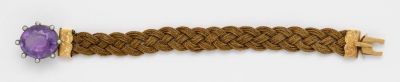 Anyag: | ametiszt; arany csat; gyöngy; haj, fonott |