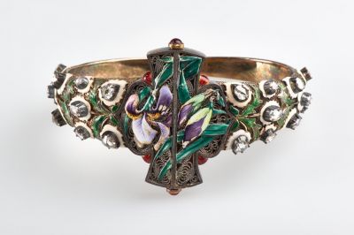 A floreális szecesszió kedvelt virágával, az írisszel díszített karperecét kiváló ötvös, a párizsi iskolázottságú Hibján Samu (1864-1919) készítette, aki a kor több kiemelkedő magyar tervezőművészével – pl. Horti Pállal (1865-1907) – is dolgozott. Hírnevét elsősorban a zománcművesség terén kifejtett oktatói és alkotói munkásságának köszönhette. 1895-ben lett az Országos Magyar Iparművészeti Főiskola tanára, ahol ő alapította meg a zománcművészeti osztályt. A zománctechnika számos fajtáját (limoges-i festett zománc, filigránzománc, stb.) sikeresen alkalmazta művein. Az 1896. évi millenniumi kiállításon nagydíjat, a torinói nemzetközi iparművészeti kiállításon 1902-ben ezüstérmet, ugyanebben az évben állami iparművészeti érmet nyert.