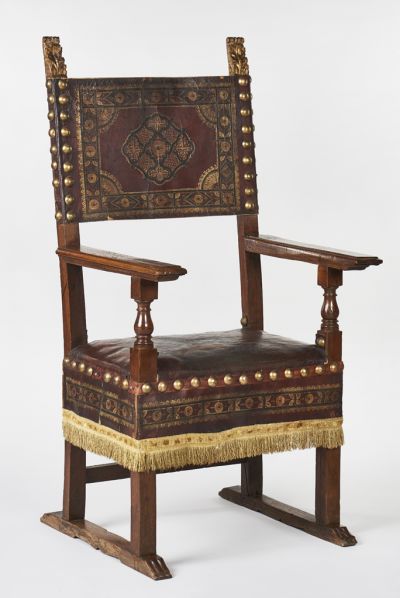 Kettős talpfán nyugvó négyhasábos lábon áll. Két mellső lába állatkarmos. Egyenes kartámláját baluszteres bábok tartják. Háttámlája téglalap alakú, fent aranyozott akantuszlevélben végződik. E széktípus itáliai eredetű, rokon darabja a firenzei Palazzo Davanzatiban is előfordul (Schotmüller 1928 445. kép). Analóg darab szerepelt