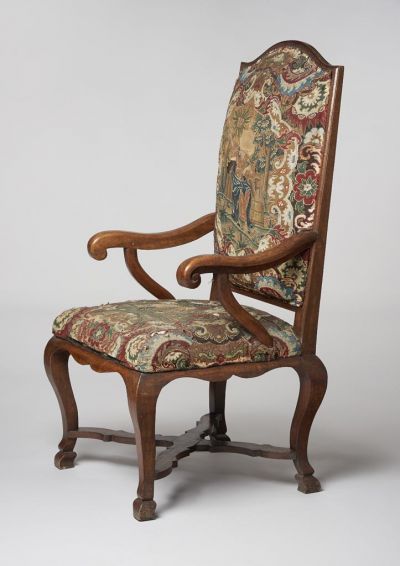 Karosszék - háttámlájának kárpitján madarat és kalitkát tartó nőalakkal