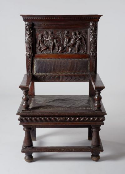 Négy, balluszter alakú lába egy-egy esztergályozott gömbön nyugszik, amely felett vízszintes merevítő lécek futnak körbe. Ülése téglalap alakú, vízszintes kartámasztó ját mindkét oldalon esztergált tag tartja. Háttámlája négyzetes, alul, az üléshez hasonlóan, bőrrel kárpitozott, a kárpitozott rész felett faragott dombormű látható, mely hét női alakot ábrázol. A háttámla keretezése, valamint az ülés kávája faragott reneszánsz díszítőelemekből van komponálva: fogsor és levéldíszek, a háttámla két szélén egy-egy faragott herma.