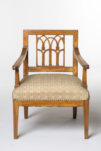 Lábai hasábosak, lefelé keskenyedők. A hátsó két láb az áttört, négyzetes háttámlában folytatódik. Ülése trapéz alakú, kartámasztója enyhén lejtős. Az egyenes záródású háttámla középmezőjét kettős gótizáló rács tagolja.