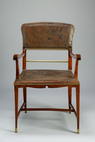 A szék négy bronzpapucsba bújtatott hasábos lábát kétoldalt és középen sima rúd köti össze. Kávája elöl íveltvonalú, ülése sima bőrrel kárpitozott, trapéz alakú. Karfája ívelt, csigavonalas. Kárpitozott, metszett virágdíszes keskeny támlája alatt réz összekötő rúd.