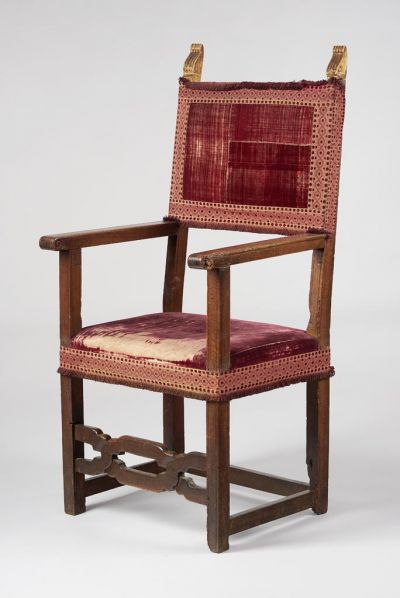 Állványa négy, négyélű facölöp, melyek közül az elülsők a vízszintes, csigás végződésű karfákat támasztják alá, a hosszabb hátsók a háttámlát tartják és keretezik be. Ülése és háttámlája téglalap alakú, fent aranyozott végződéssel. Az állványt kétoldalt és hátul szerkezetileg szükséges sima, elöl faragott deszka merevíti. Ülés és támla paszománttal szegett meggyszín bársonnyal kárpitozott.