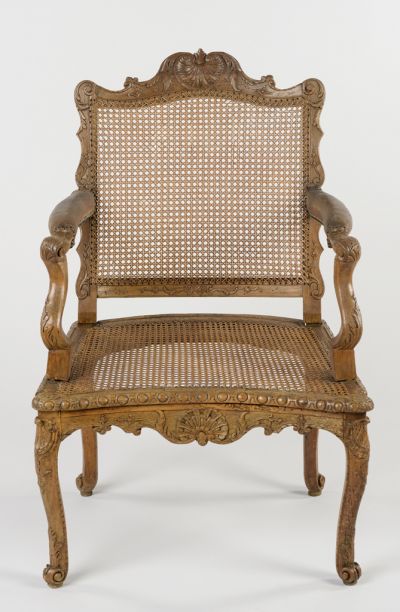 Négy hajlított, kifelé hajló csigás lábon áll. Mellső kávája homorú, középen kagyló motívummal ékes, ebből jobbra és balra szimmetrikus elrendezésű virágszálak hajladoznak. A mellső éleken kagylódísz. Trapéz alakú ülése keretét pálcikára fűzött tojássor díszíti. A függőleges kartámasztó kis hasábra állított, hullámosan ívelő a vízszintes bőrrel bevont. Négyzetes támlájának keretén csigás, leveles faragás. E karosszékek egy rokon darabját publikálja (Holm, Edith: Stühle von der Antike bis zur Moderne. München, 1978, 94 p., 142. kép).