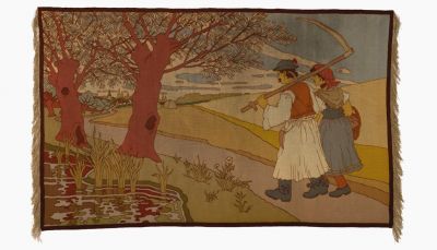A csöndes, békés hangulatot árasztó kárpit egyike az 1900-as Párizsi Világkiállításon bemutatott faliszőnyegeknek. A kiállításon a Faragó Ödön tervezte, Bernstein József és fia által kivitelezett férfi fogadószoba falán függött. Stílusa a kor festészetéhez áll közel. E korai magyar kárpitokat a paraszti élet mindennapi eseményei, a hazai táj szépsége ihlette. Az aratásból hazatérő parasztpár a képmező jobb sarka felől vezető úton ballag a kanyargó ösvény végén előbukkanó, távoli falucskába.